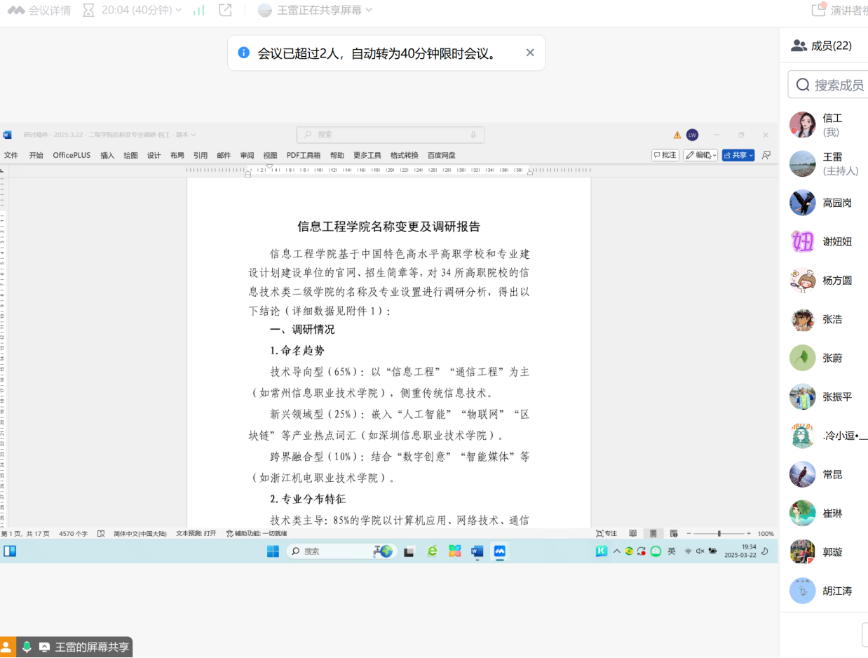 为精准对接区域数字经济产业发展需求,深化产教融合特色,2025年3月22日晚7:30,Beat365官方网站通过腾讯线上会议平台召开学院名称优化专题研讨会。学院院长王雷主持会议,党政领导班子、副科级干部、教研室主任、副主任及教师代表共22人参会,共同探讨学院名称与办学定位的战略性升级方案。