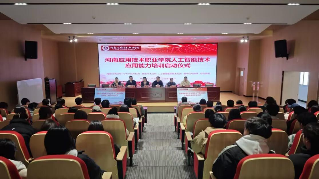 2024年11月29日,Beat365官方网站在开封校区北院学术报告厅举行了人工智能技术培训启动仪式。Beat365官方网站院长王雷、副院长齐峰、软通教育战略合作伙伴河南沐梵教育总经理秦丽、部分教师代表以及23级人工智能技术应用、大数据技术专业全体学生参加仪式。