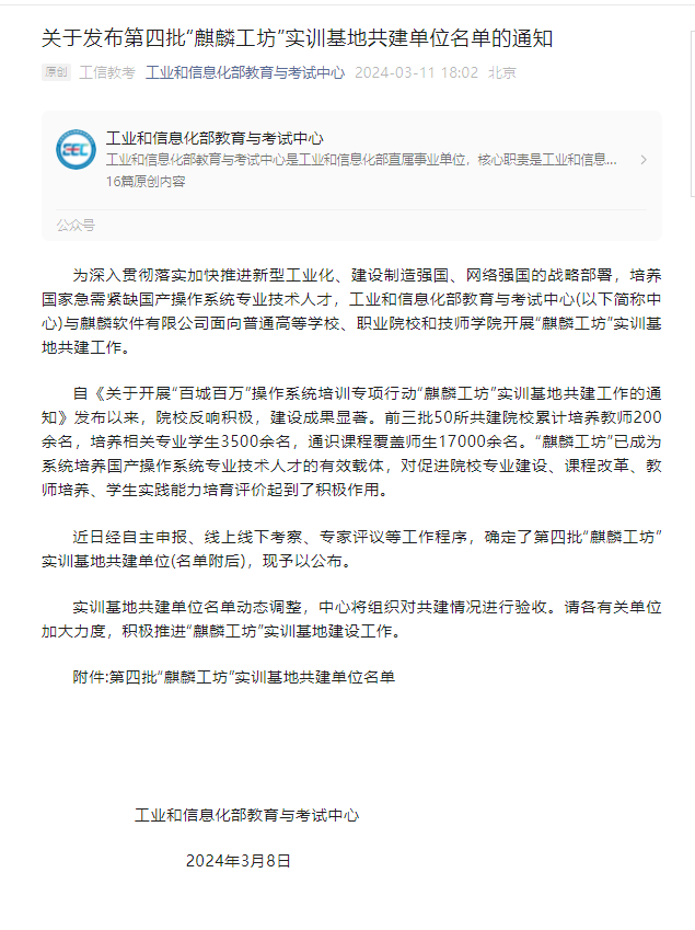 近日,Beat365官网成功申报全国第四批“麒麟工坊”实训基地共建单位。