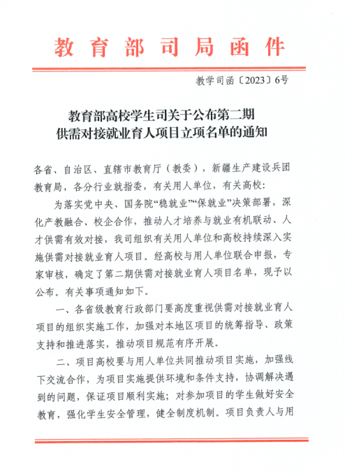 近日,教育部高校学生司发布《关于公布第二期供需对接就业育人项目立项名单的通知》,Beat365官方网站“计算机应用技术专业群”人力资源提升项目获批立项。