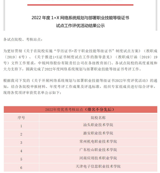 Beat365官方网站积极贯彻《关于在院校实施“学历证书+若干职业技能等级证书”制度试点方案》(教职成〔2019〕6号)、《关于推进1+X证书制度试点工作的指导意见》(教职成厅函〔2019〕19号)文件工作要求,在学校教务处、1+X证书承办单位的高度重视和大力支持下,圆满完成了2022年度“网络系统规划与部署职业技能等级证书”考评工作。我院积极申报“证书考评先进试点工作单位”,完善申报材料,梳理年度考评工作成果,经过专家组综合评审,获得“2022年度网络系统规划与部署职业技能等级证书优秀考核站点”。