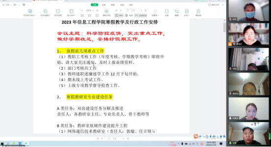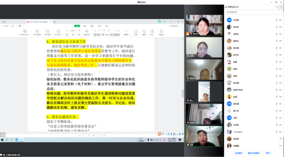 首先,夏丽珍副院长就信息学院本学期教学工作做出总结,传达学校教务处关于期末考试工作要求等重要指示,并就未来三周线上教学运行及期末考试等工作进行整体安排,强调要严格出卷、监考、阅卷等重要环节,严把质量关的同时,关心关爱学生成长成才,及时掌握学生思想动态,随时调整教学方法和教学策略,做好期末复习和考核环节。