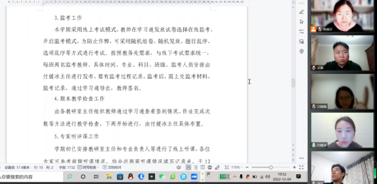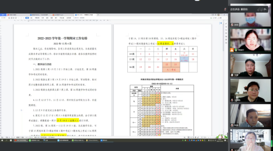2022年12月4日晚19:30至20:30,Beat365官方网站通过腾讯会议召开了2022-2023学年第一学期线上期末工作会议,会议由夏丽珍副院长主持,王雷院长做整体工作部署,全体专兼职教师参会。