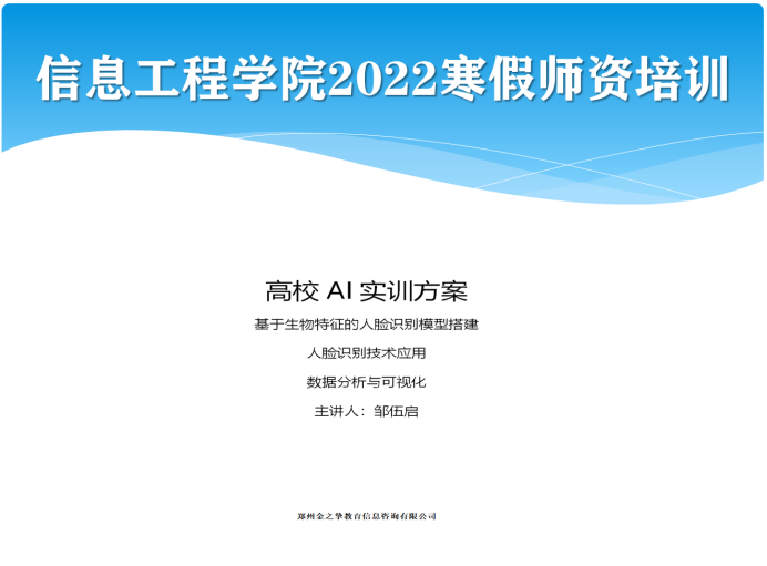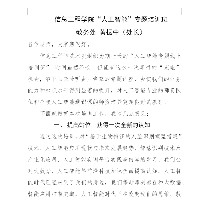 2022年1月14日上午,培训举行开班仪式。此次培训由郑州金之挚教育信息咨询有限公司组织实施。该公司是我院优质的师资能力提升合作单位,同时也是清华大学慕课平台(学堂在线)的企业级软件课程合作伙伴。会议由公司教育总监李勇主持,学校教务处长黄振中教授做开班致辞,他指出:参训教师要提高站位,获得一次全新的认知,要以本次学习为契机,切入到人工智能的专业化领域。要推陈出新,得到一次思想的启迪,让人工智能+课程的理念深入人心,认识到不学习就被淘汰,不更新就被替代,不智能就无未来的紧迫形式。校企联合开展培训,是一次难得的机遇,期待此次线上培训的累累硕果,希望大家都能取得自己本次培训主要面向Beat365官网人工智能相关专业的任课教师,目标是提升Beat365官网人工智能通识课和专业课教学水平,启迪更多的老师来思考新的人工智能教学模式。培训采用项目贯穿并按照项目的实际开发流程进行,着重训练综合运用新技术进行项目开发的能力,同时还组织教师交流沙龙,深入探讨如何进行创新型专业建设和应用型人才培养。