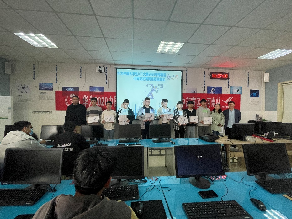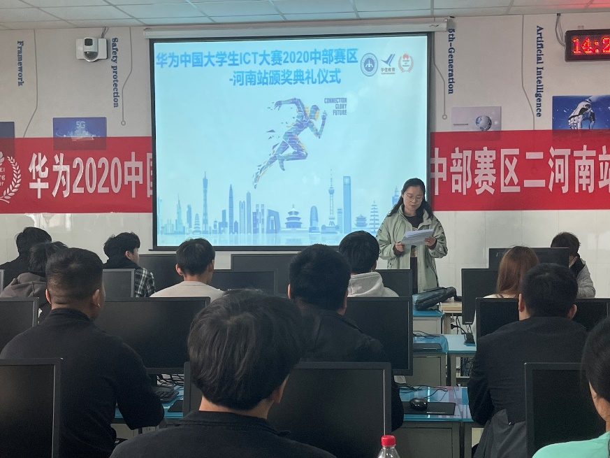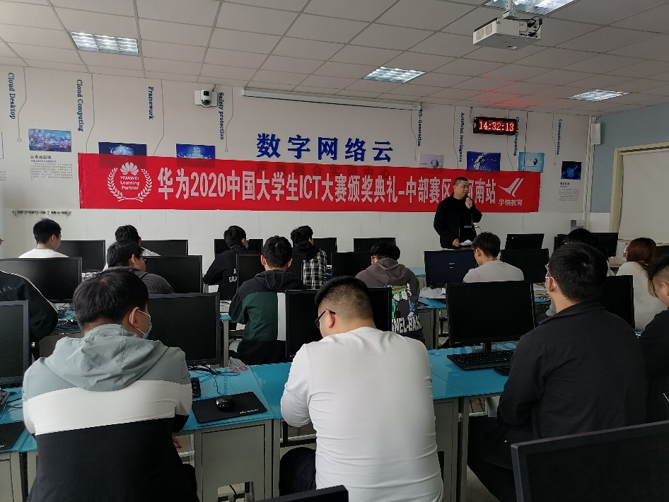 4月8日下午,Beat365官方网站在E420举办《2020华为中国区大学生ICT大赛中部赛区二——河南实践赛网络赛道》颁奖仪式,本次仪式由网络通信技术教研室主任郭璇主持,我院网络通信技术教研室全体教师、华为HALP郑州市宇信职业培训中心市场部总监王静晓,经理冯欣欣及19级参赛学生到场参加。