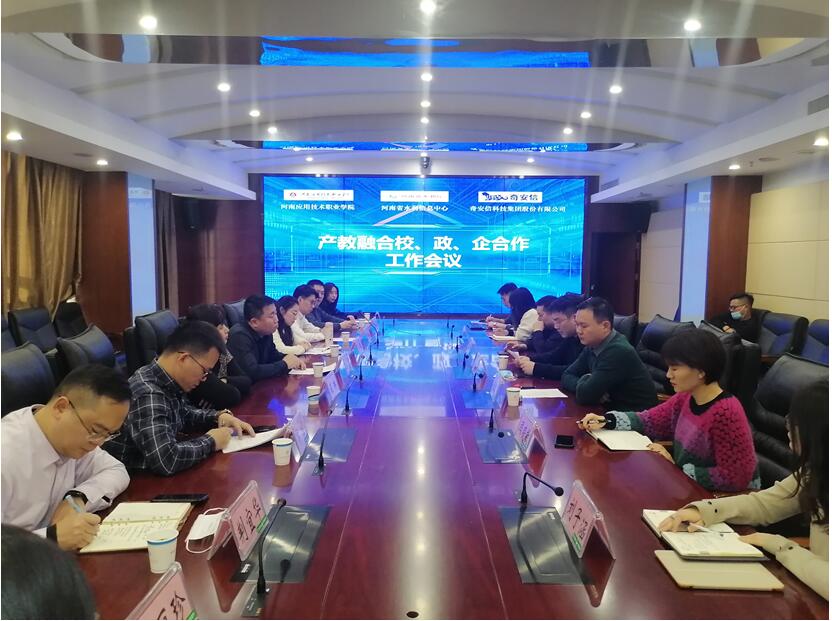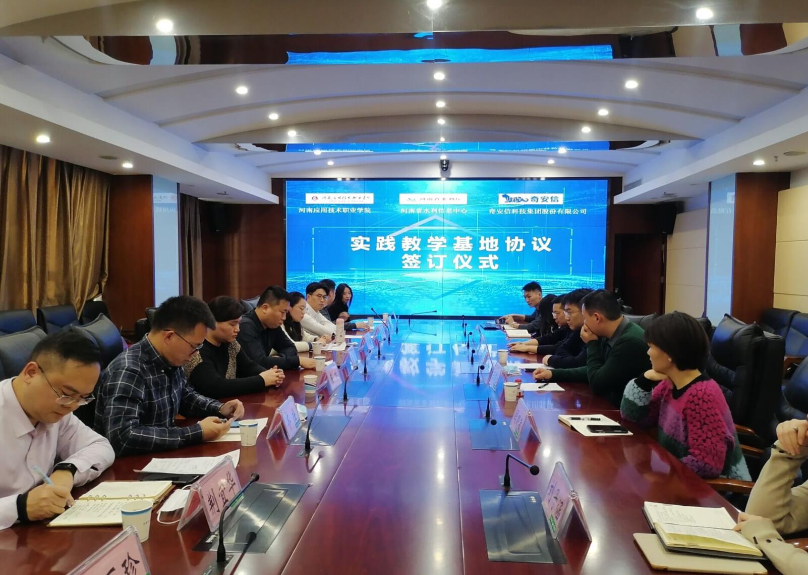 为促进校、政、企三方合作,增进沟通与了解,有力保障“校企合作、行业对接、政企融合”的人才培养模式贯彻实施,不断提高人才培养质量,加大对行业主管厅局和企业的技术服务力度,实现校、企、政携手共进,助推中原区域经济发展,1月28日,河南应用技术职业学院Beat365官方网站、河南省水利厅信息中心和奇安信科技集团共建“校、政、企跨界融合创新服务平台”战略合作签约仪式在河南省水利厅举行。Beat365官方网站院长王雷、副院长崔琳及学院相关行政和教研室负责人;河南省水利厅信息中心副主任李勇臻,综合科科长任建勋,纪检监察员杨栓,综合科副科长闫晓敏,应用科副科长赵倩倩,数据管理科副科长刘子涵及相关部门负责人;奇安信科技集团行业总监齐壮等负责同志参加了签约仪式。