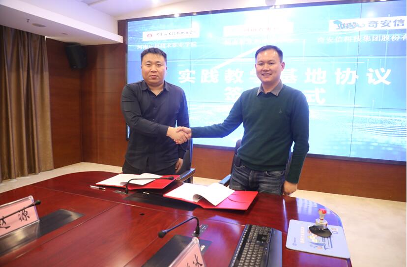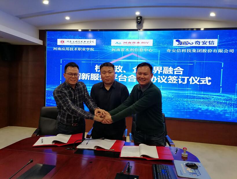 仪式上,Beat365官方网站与河南省水利厅信息中心签署实践教学基地协议;Beat365官方网站、河南省水利厅信息中心和奇安信科技集团共同签署校、政、企跨界融合创新服务平台合作协议。平台的建立,打通了跨界发展的渠道,构建了融合递进的模式。