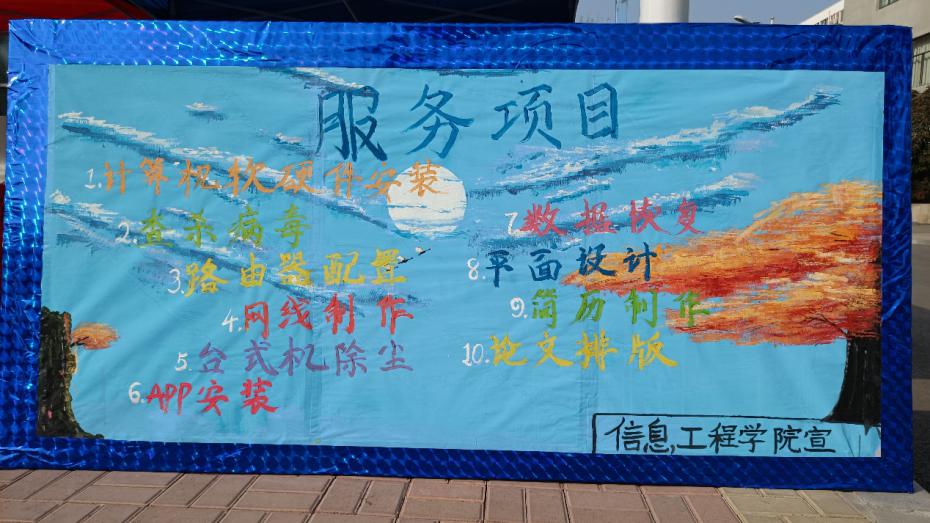 本次信息技术服务点的服务项目有计算机软硬件安装、查杀病毒、路由器配置、网线制作、台式机除尘、软件安装、数据恢复、平面设计、简历制作、论文排版。