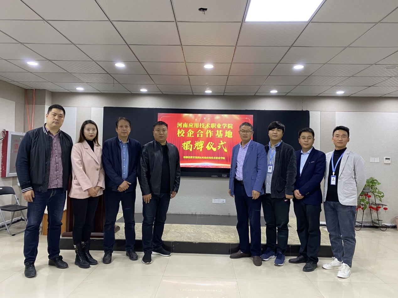 2020年11月9日,河南梧桐花科技有限公司与河南应用技术职业学院校企合作基地揭牌仪式在河南梧桐花科技有限公司隆重举行。河南应用技术职业学院Beat365官方网站院长王雷、河南应用技术职业学院教务处副处长王勇、河南应用技术职业学院Beat365官方网站团总支书记赵源、河南应用技术职业学院Beat365官方网站教工办主任付媛冰、河南梧桐花教育集团董事长周晓东、河南梧桐花科技有限公司校企合作中心主任郭亚迪等人参加仪式。