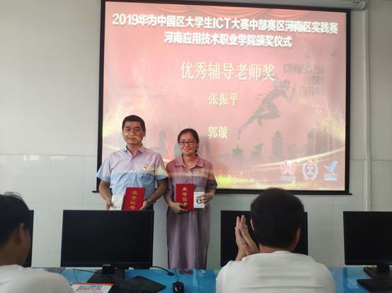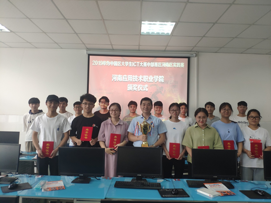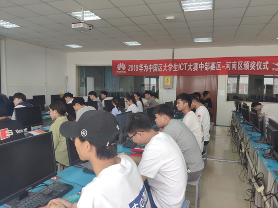 孟夏之日,万物并秀。2019年华为中国区大学生ICT大赛中部赛区-河南区实践赛落下帷幕,今年是我院大学生第三次参加该项赛事,也是历年来参加人数最多、取得成绩最为辉煌的一次。华为是全球领先的ICT(信息与通信)基础设施和智能终端提供商,致力于把数字世界带入每个人、每个家庭、每个组织,构建万物互联的智能世界。华为生态大学坚持打造从人才进校园到成为企业管理人员的全周期人才供应链,致力于成为中国数字化转型的人才引擎。为进一步促进ICT人才生态健康、良性发展,持续为产业链输送优质ICT人才,华为联合华为授权培训合作伙伴举办“2019华为中国区大学生ICT大赛”。本次河南区实践赛由华为生态大学主办、郑州宇信职业培训中心赞助,于2019年4月27日在郑州财经学院进行,比赛的形式为在线考试,参加的选手来自全省41所本专科院校,共有1000多名学生。比赛结束后主办方宣布于五月中旬通告比赛成绩。此次比赛我院共有35名选手积极踊跃报名参加,经过2个多月的组织、培训、竞赛,最后有23名选手入围中部赛区的前100名, 16名选手获得奖励,其中郭琪琳、宋冰涛两位同学以中部赛区第52和54的名次获得一等奖,由于组织得力、成绩突出,我院被授予优秀团体奖,张振平和郭璇两位老师获得优秀指导老师荣誉称号。我院于5月29日举办了“2019年华为中国区大学生ICT大赛中部赛区-河南区”颁奖仪式,对所有参赛学生进行了鼓励并对获奖老师和学生进行了表扬。通过这次比赛,我院学生开阔了视野、增加了网络知识和技能,也为学生开拓了一条新的就业途径!