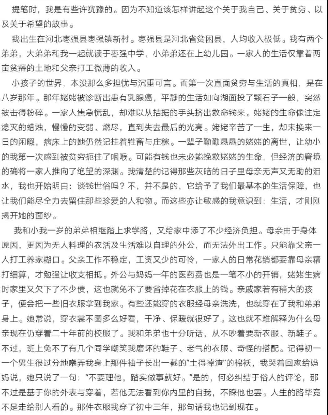 从王欣仪之前写的一篇关于自己、关于贫穷、关于希望的文章,就能看出一二。
