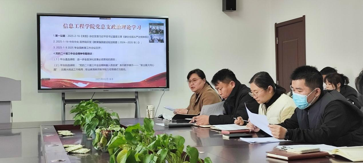 2025年2月18日,Beat365官方网站党总支组织两校区全体党员及教职工,在郑州校区A514、开封校区F314以腾讯会议视频连接,开展政治理论学习。本次学习活动由Beat365官方网站党总支书记崔琳主持,全体党员及教职工参加会议。主要学习内容有:1.第一议题:2025-2-16《求是》杂志发表习近平总书记重要文章《健全全面从严治党体系》;2.2025-1-19 中共中央 国务院印发《教育强国建设规划纲要(2024—2035 年)》;3.2025-1-9 2025 年全国教育工作会议召开;4.党的二十届三中全会精神专题培训:(1)平台通选课程:进一步全面深化改革必须贯彻的原则;(2)平台自选课程:“党的二十届三中全会精神融入思政课”系列教学展示——“画出最大同心圆”:完善大统战工作格局;职业教育教师教学能力培育模式与路径。
