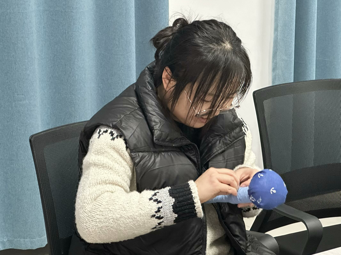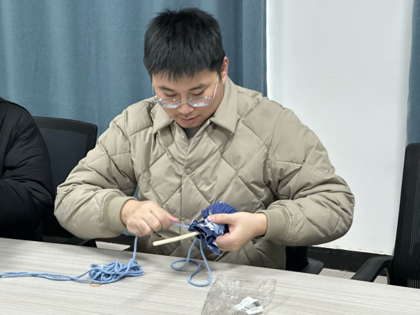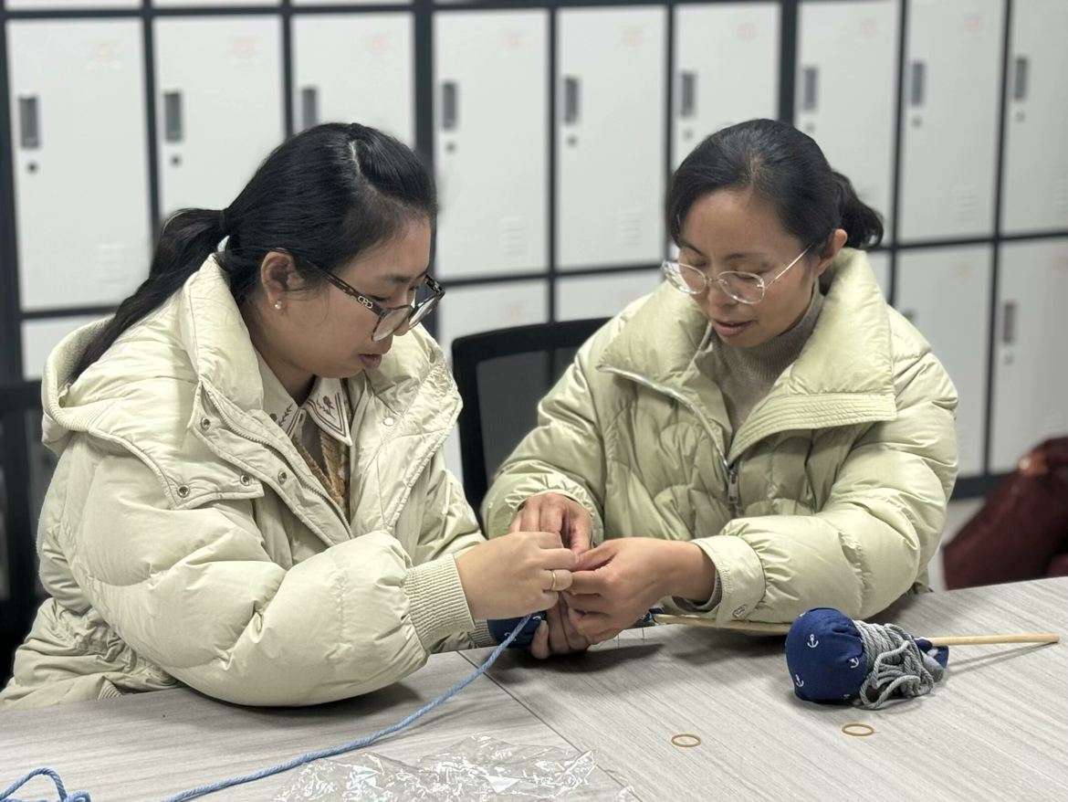 活动现场,大家分组协作、互帮互助,将艾草捋顺、压实、用棉布紧密包裹之后,再用棉线固定,一个个散发着清新艾草香味的手工锤逐渐成形。