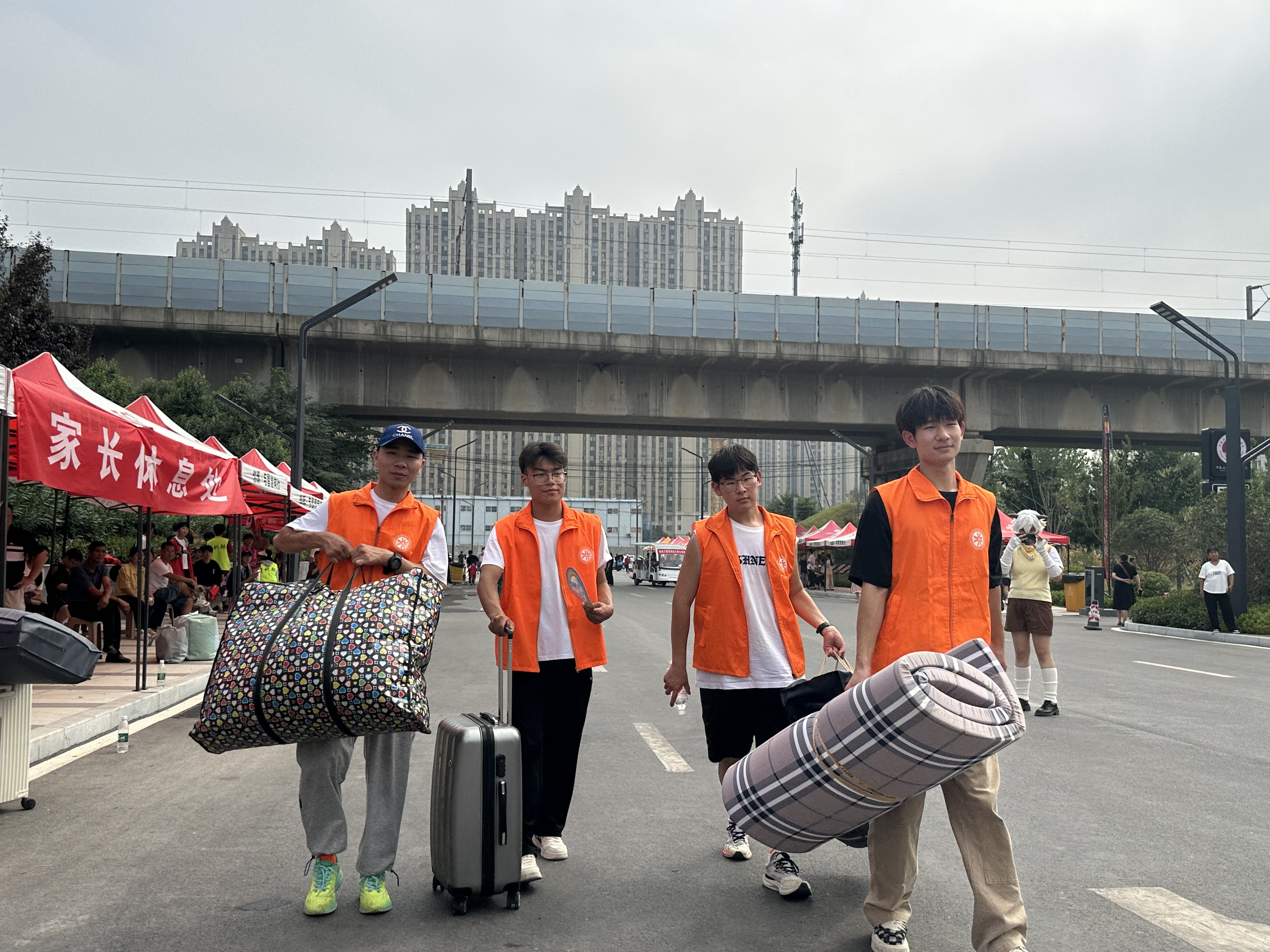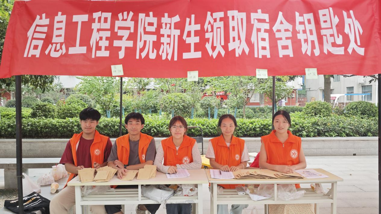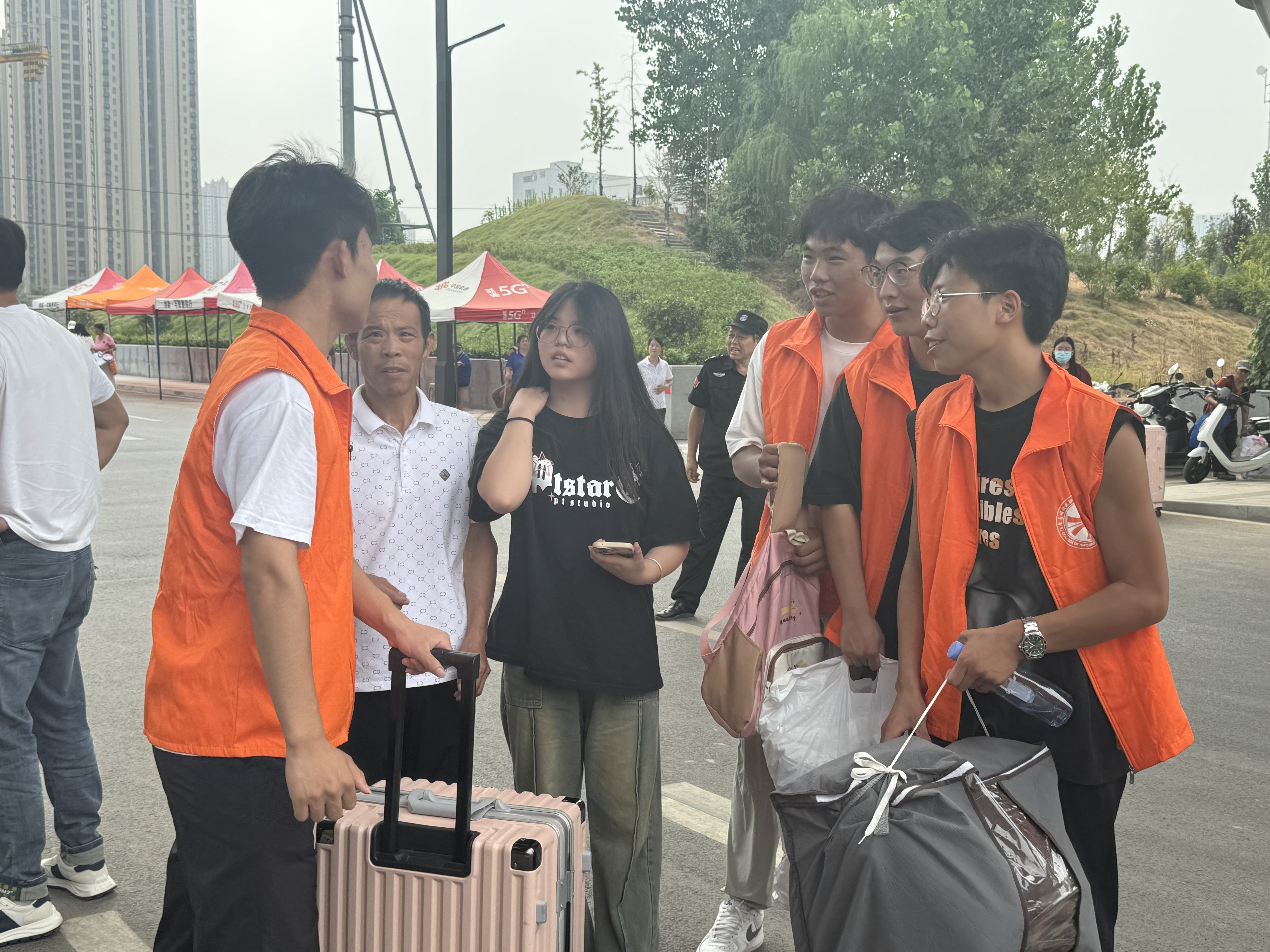 在清晨的第一缕阳光中,志愿者们早早地来到了迎新现场,他们身着统一的橙色马甲,脸上洋溢着热情的笑容,为新生们提供热情周到的服务。