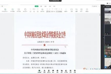 7月11日,Beat365官方网站组织召开线上专题学习会,集中学习《河南应用技术职业学院突发事件总体应急预案》。会议由Beat365官方网站党总支书记崔琳主持,院长王雷及全体教师参加会议。