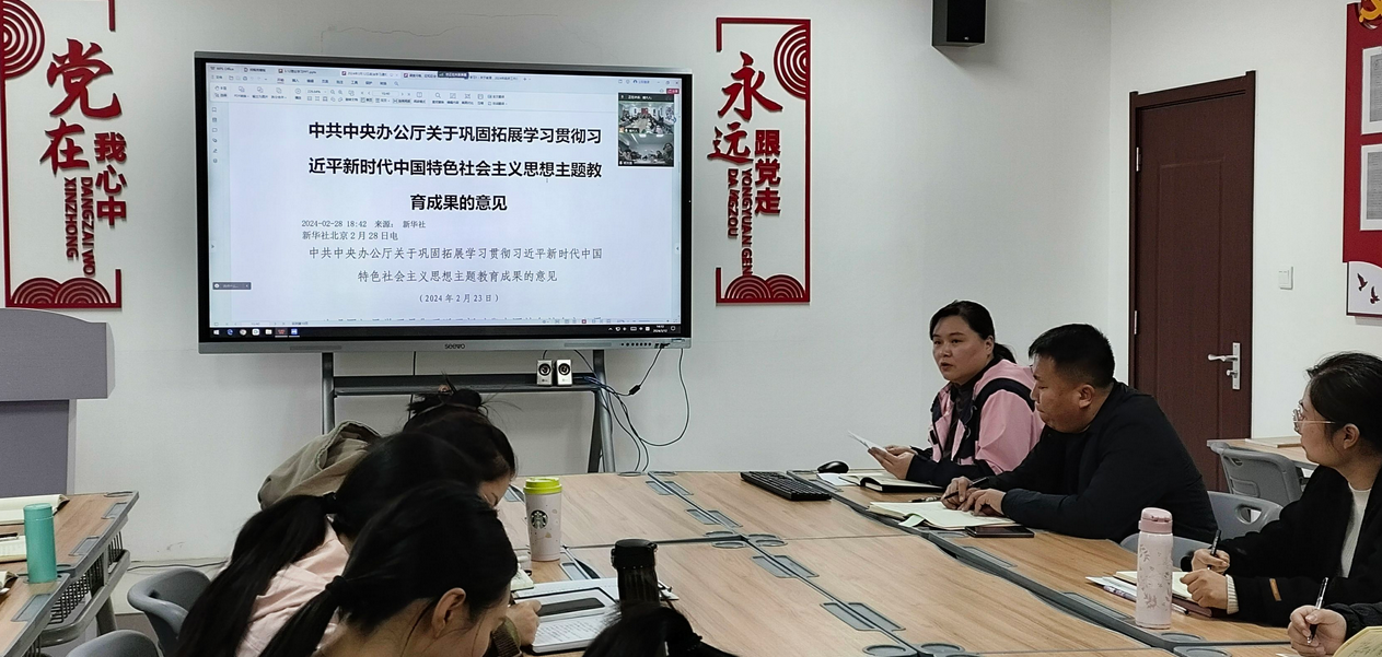 崔琳书记主持会议,重点领学2024-2-23中共中央办公厅关于巩固拓展学习贯彻习近平新时代中国特色社会主义思想主题教育成果的意见。她指出,一要坚持以学铸魂,持续做好学习贯彻习近平新时代中国特色社会主义思想的深化、转化工作。从思想上正本清源、固本培元,坚定理想信念,铸牢对党忠诚,站稳人民立场,自觉在政治立场、政治方向、政治原则、政治道路上同以习近平同志为核心的党中央保持高度一致,进一步夯实全党团结统一的思想基础。二要坚持以学增智,不断从党的创新理论中悟规律、明方向、学方法、增智慧。学深悟透习近平新时代中国特色社会主义思想,把握好这一思想的世界观和方法论,运用好贯穿其中的立场观点方法特别是“六个必须坚持”,把看家本领、兴党本领、强国本领学到手,着力提升政治能力、思维能力、实践能力,担负好党和人民赋予的政治责任。
