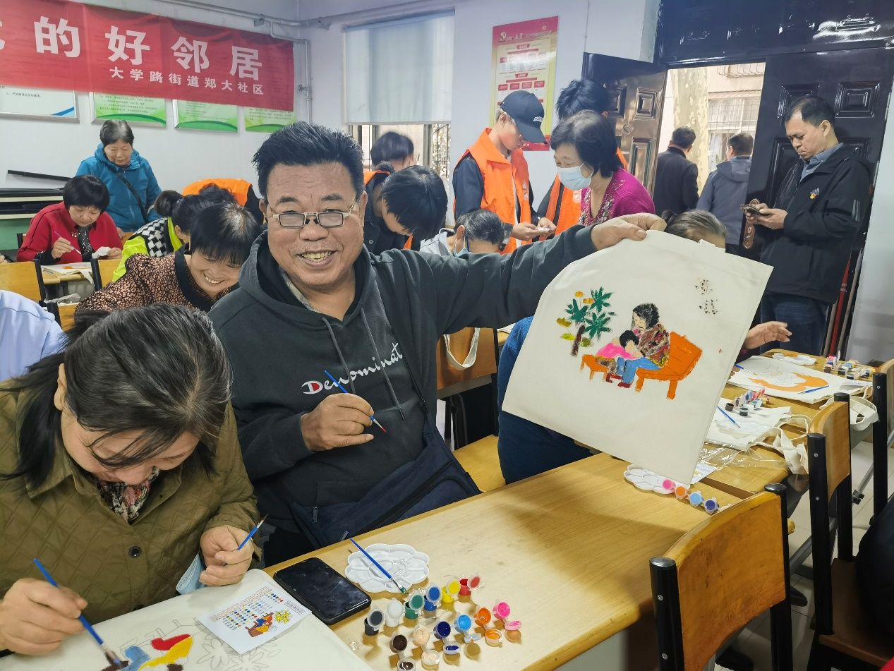 活动中,老人们选好自己喜欢的图案开始绘制布袋,根据布袋上的中图案进行填色创作。老人们聚精会神,相互交流绘画技巧,充分展现了新时代老年人热爱生活、积极乐观的精神风貌。党员教师和学生入党积极分子帮助老人们选颜色、调颜色、洗笔刷、讲技法,在帆布包上涂鸦创作,不仅传递了社会对老年人的温暖与关怀,还展示着职教师生的综合素养,现场气氛一派祥和。