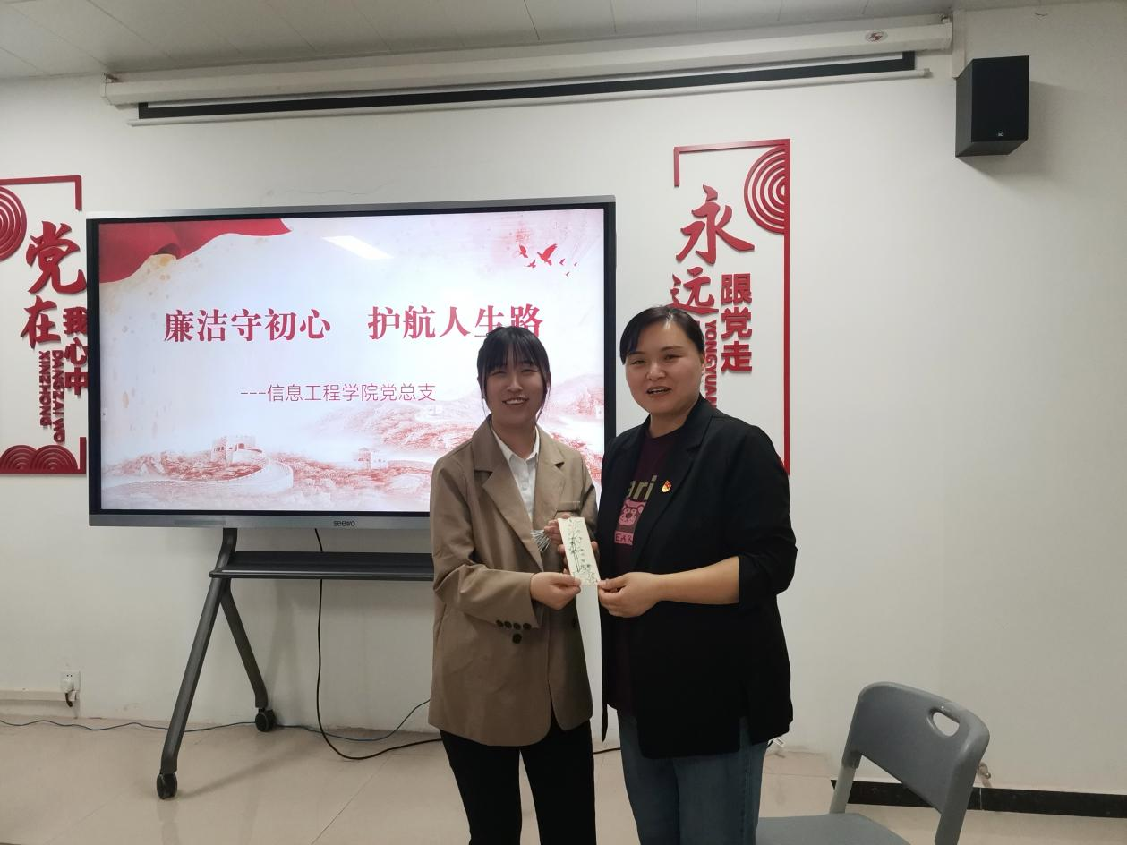 崔琳代表学院党总支向毕业生党员赠送廉洁书签,殷切希望同学们自觉加强理论学习,不断锤炼党性修养,在新的学习和工作岗位上充分发挥党员的先锋模范作用,积极奉献,奋力进取,开启人生新的华章。