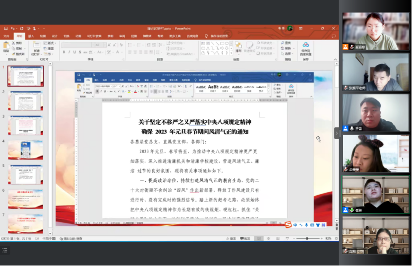 会议第二项,崔琳梳理总结2022年学院党建工作要点及廉政工作落实情况,传达并组织学习学校纪委近期下发的三个重要文件。会议中指出,按照《河南省纪委监委驻省教育厅纪检监察组关于2023年元旦春节期间纠”四风”树新风工作提示》及学校纪委《关于坚定不移严之又严落实中央八项规定精神 确保 2023 年元旦春节期间风清气正的通知》精神,Beat365官方网站党总支在2022年12月29日、31日组织全体教职工进行了相关文件学习,在2023年1月4日、6日分两次学习了违反中央八项规定典型案例、违反教师职业行为典型案例,并在1月5日采用新媒体形式进行了集体廉政提醒谈话。1月11日上午,组织全体教职工学习《习近平在二十届中央纪委二次全会上发表重要讲话》、2022年《以案释法》第十一辑、2022年《以案释法》第十二辑,崔琳书记再次强调元旦春节既是“人情关”,更是“廉洁关”,要求每一位教职工在元旦春节期间牢记校纪委通知精神,纠四风树新风,过一个廉洁祥和文明的假期。