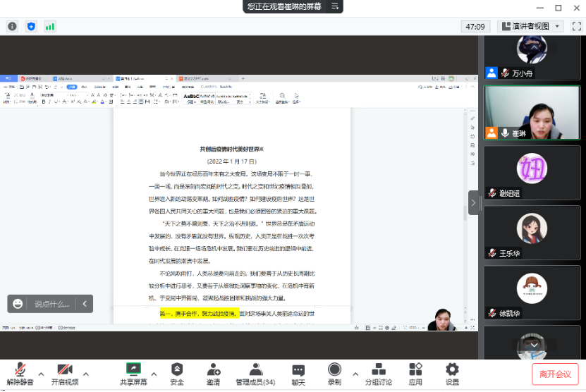 为持续学习贯彻好党的二十大精神,达到了统一思想、坚定信心、明确方向、鼓舞斗志的目的,12月13日下午,Beat365官方网站党总支组织东西校区全体党员及教职工,在腾讯会议开展线上政治理论学习活动,集中学习了:《求是》2022年第23期--在党的十九届七中全会第二次全体会议上的讲话(12月1日);《习近平谈治国理政》第四卷:十九、完善全球治理,践行真正的多边主义;《全面从严治党向基层延伸》:第七章上下联动推动巡视巡察向基层延伸;《习近平经济思想学习纲要》:十二、统筹发展和安全--关于我国经济发展的重要保障;《习近平生态文明思想学习纲要》:八、共谋全球生态文明建设之路--关于生态文明建设的全球倡议。本次政治理论学习由Beat365官方网站党总支书记崔琳主持,全体党员及教职工参加会议。