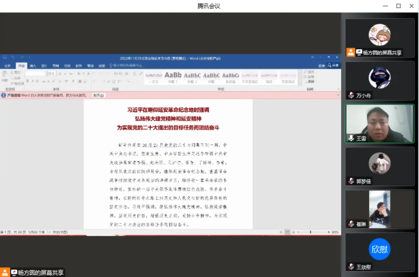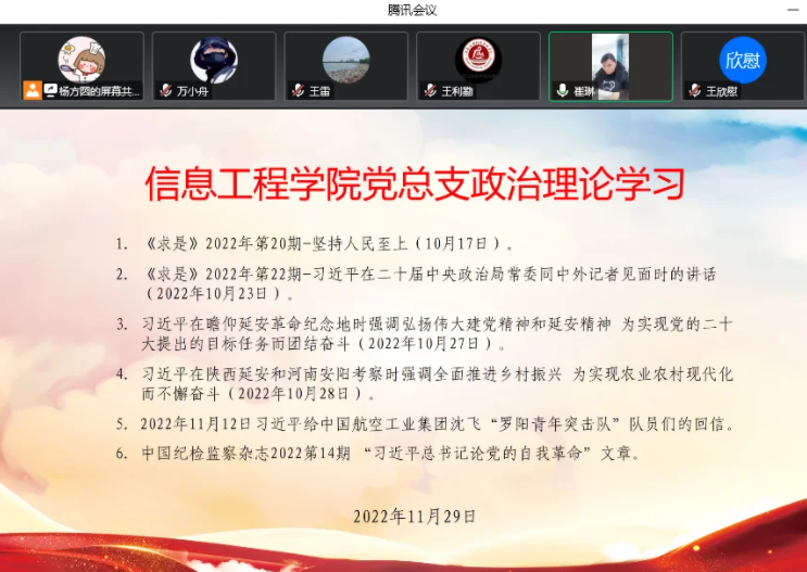 为进一步深入学习贯彻党的二十大精神,牢牢把握新时代新征程的使命任务,2022年11月29日下午,Beat365官方网站党总支组织东西校区全体党员及教职工,在开封北院A306及腾讯会议开展线上线下同步的政治理论学习活动,集中学习了:《求是》2022年第20期-坚持人民至上;《求是》2022年第22期-习近平在二十届中央政治局常委同中外记者见面时的讲话;习近平在瞻仰延安革命纪念地时强调弘扬伟大建党精神和延安精神 为实现党的二十大提出的目标任务而团结奋斗;习近平在陕西延安和河南安阳考察时强调全面推进乡村振兴 为实现农业农村现代化而不懈奋斗;2022年11月12日习近平给中国航空工业集团沈飞“罗阳青年突击队”队员们的回信;中国纪检监察杂志2022第14期 “习近平总书记论党的自我革命”文章。本次学习由Beat365官方网站党总支书记崔琳主持。
