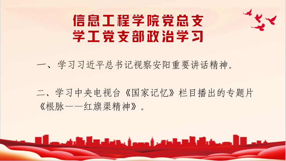 专题组织生活会上,党员们认真学习了习近平总书记视察安阳重要讲话精神,集中观看了中央电视台《国家记忆》栏目播出的专题片《根脉——红旗渠精神》,再次走进这段感动人心的历史。1969年7月,在党的领导下,林县人民大干历时近10年,战胜各种艰难险阻,在太行山上完工了全长1500公里的红旗渠,结束了林县地区十年九旱、水贵如油的苦难历史,不仅解决了千百年来人民的吃水灌溉问题,更孕育形成了自力更生、艰苦奋斗、团结协作、无私奉献的红旗渠精神。