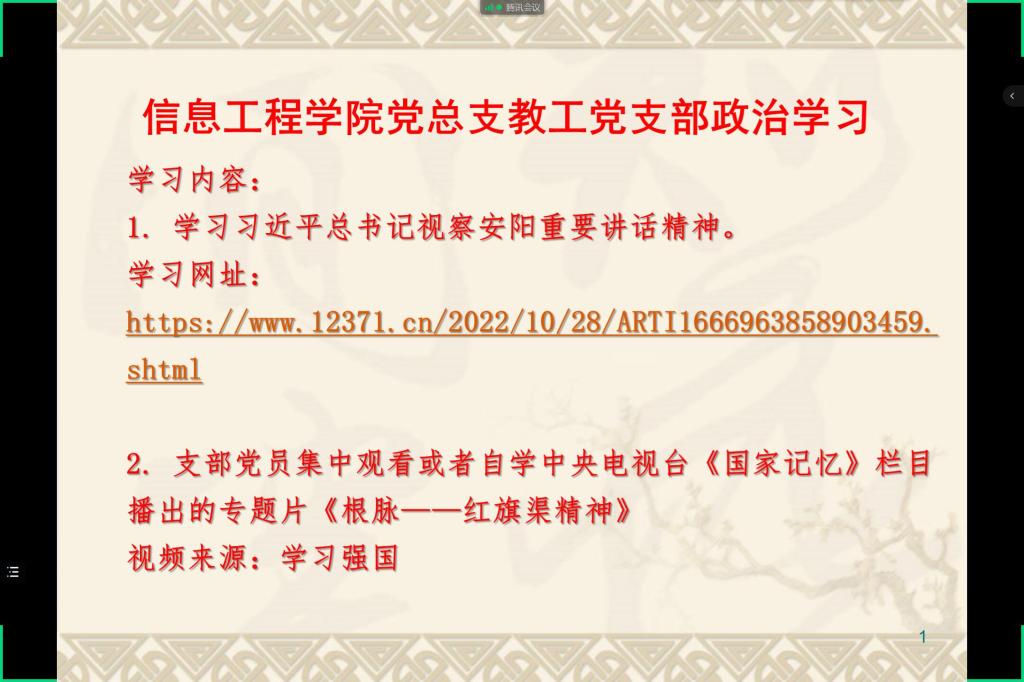 按照省委教育工委《关于以“深入学习习近平总书记视察安阳重要讲话精神,大力弘扬红旗渠精神”为主题召开专题组织生活会的通知》及学校党委组织部要求,Beat365官方网站党总支学工党支部及教工党支部于2022年11月23日分别召开线上专题组织生活会,由崔琳书记和王雷院长分别主持,Beat365官方网站党总支全体党员参加会议。