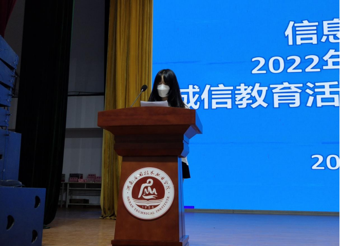 其次,由考生代表动漫1901班王美月同学进行发言,王美月同学根据自身的学习感受与同学们进行分享并倡导全体考生积极备考、诚信考试。