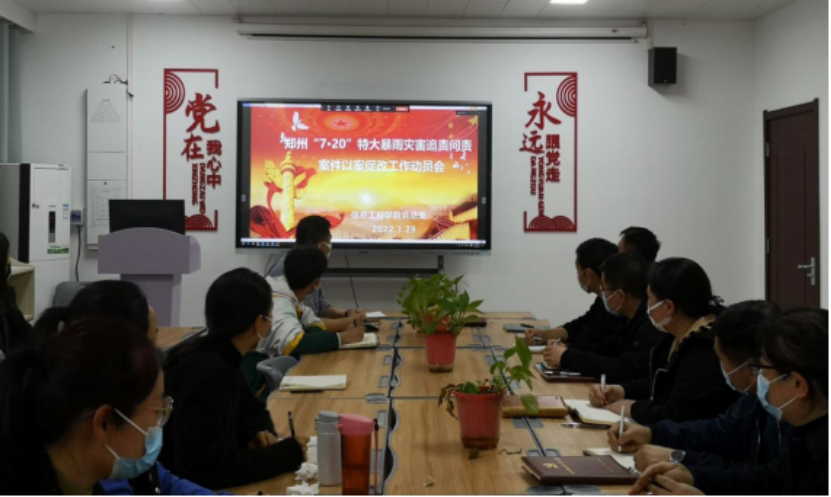 首先,楚斌书记宣读了Beat365官网开展郑州“7·20”特大暴雨灾害追责问责案件以案促改工作实施方案,并做了详细的安排部署。他要求全体教师切实提升政治站位,提高思想认识,把以案促改作为重要的政治任务,切实把查摆问题、整改问题与提升能力、锤炼作风相结合,强化督查指导,对督导检查中发现的问题,责令相关负责人限时整改,有效提高学院的抗疫防灾减灾救灾能力和应急处突能力,确保学校决策部署落实。