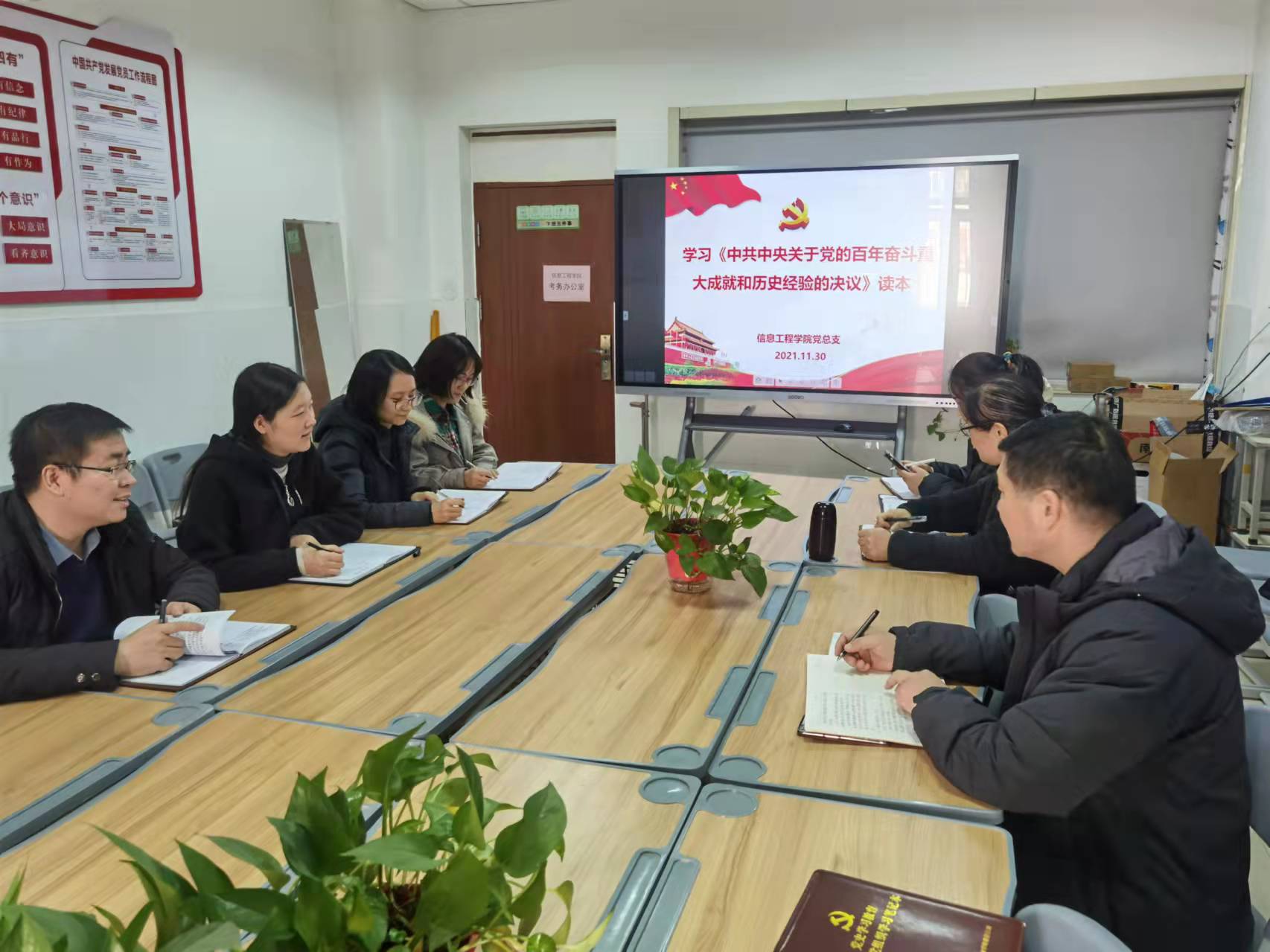会上, 张振平同志传达了《党的百年重大成就和历史经验决议》重要文件精神。党的百年奋斗重大成就和历史经验,是在建党百年历史条件下开启全面建设社会主义现代化国家新征程、在新时代坚持和发展中国特色社会主义的需要;是确保全党步调致向前进的需要;是推进党的自我革命、提高全党斗争本领和应对风险挑战能力,永葆党的生机活力团结带领全国各族人民为实现中华民族伟大复兴的中国梦而继续奋斗的需要。会上老师们积极讨论并做了笔记。
