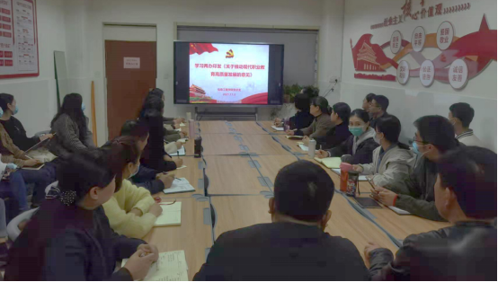 接着楚斌书记传达了学习《关于推动现在职业教育高质量发展的意见》重要文件精神,会议强调要以习近平新时代中国特色社会主义思想为指导,深入贯彻党的十九大和十九届二中、三中、四中、五中全会精神,坚持党的领导,坚持正确办学方向,坚持立德树人,优化类型定位,深入推进育人方式、办学模式、管理体制、保障机制改革,切实增强职业教育适应性,加快构建现代职业教育体系,建设技能型社会,弘扬工匠精神,培养更多高素质技术技能人才、能工巧匠、大国工匠,为全面建设社会主义现代化国家提供有力人才和技能支撑。
