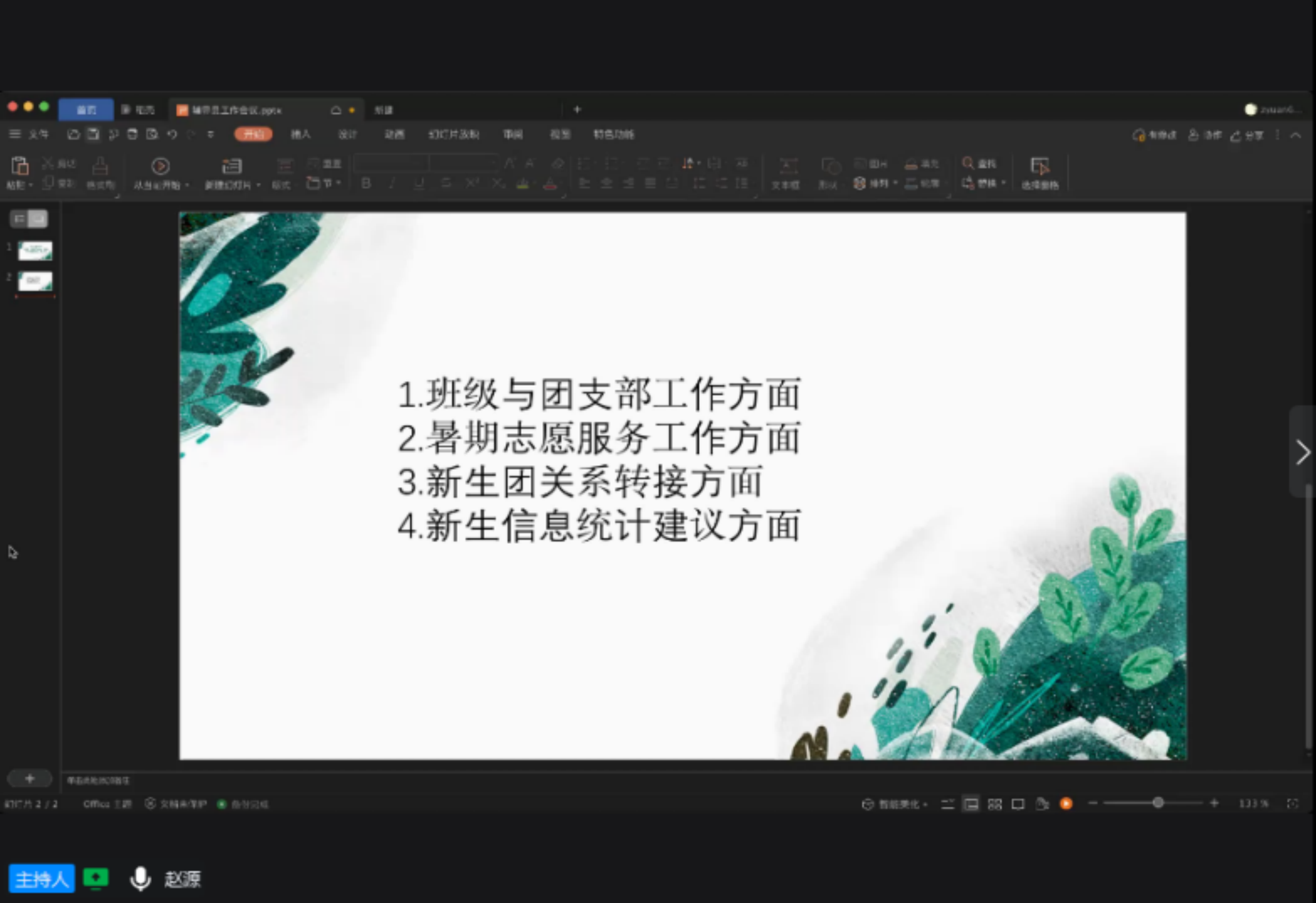最后,团总支赵源书记从班级与团支部工作、暑期志愿服务、新生团关系转接、新生信息统计建议4个方面对共青团工作进行了总结和安排。