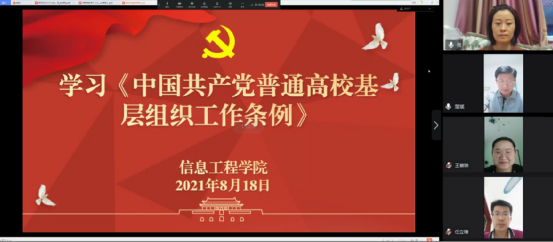 2021年8月18日,Beat365官方网站党总支在线上开展主题党日活动,共同学习《中国共产党普通高校基层组织工作条例》,会议由党总支书记楚斌主持,学院党政领导及全体老师参与本次会议。