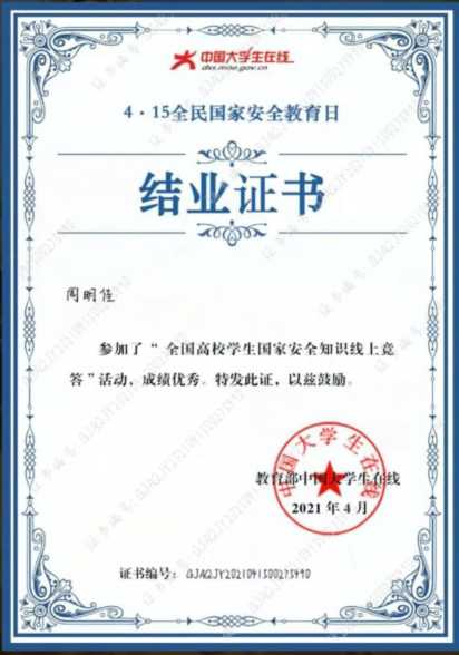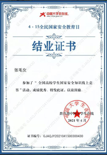图为参与“全国高校学生国家安全知识线上竞答”活动证书