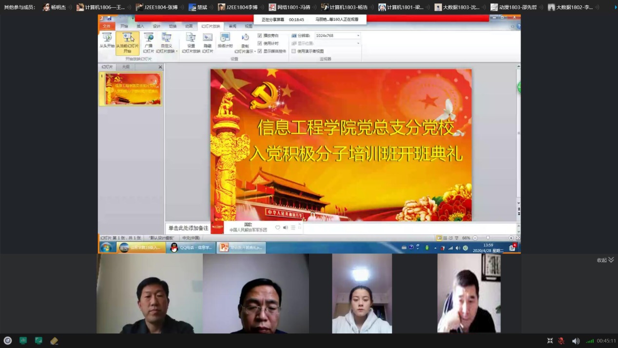 为进一步做好党员发展工作,提升入党积极分子的政治素养,结合当前疫情防控形式,2020年4月28日,Beat365官方网站党总支分党校入党积极分子培训班开班典礼及第一次党课培训通过QQ群屏幕共享隆重召开。担任本次典礼主持的是Beat365官方网站党总支副书记杨明杰,出席本次典礼的有:Beat365官方网站党总支书记楚斌书记、王雷院长、崔琳副院长、团总支赵源书记、学生工作办公室闫莹主任、党总支组织委员张振平老师、党总支学生支部组织委员夏丽珍老师、党总支教工支部组织委员马丽艳老师以及Beat365官方网站东西校区共154 名品学兼优的入党积极分子。