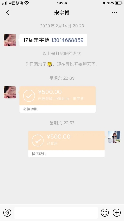 在看到疫情的新闻报道后,宋宇博十分关心武汉人民的生命安全。响应学院号召,他于3月7日向奋斗在抗疫一线的工作人员捐赠500元。正是因为有着太多像他一样的大学生,像他一样的无私奉献者,才遏制了疫情的发展,推动了抗疫防控工作的进行,让我们对打赢这场疫情攻坚战信心满满。