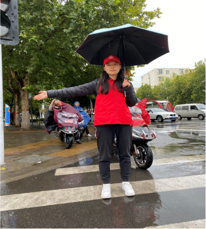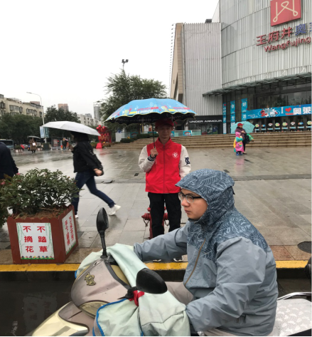 他们身穿红色马甲,冒着大雨,认真引导行人有序停车,劝阻行人不规范停车,协助辅警指挥交通并宣传文明交通常识。