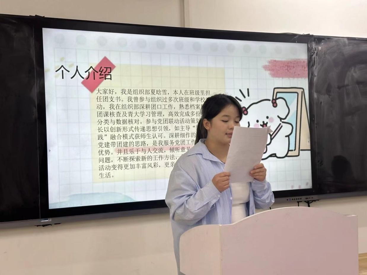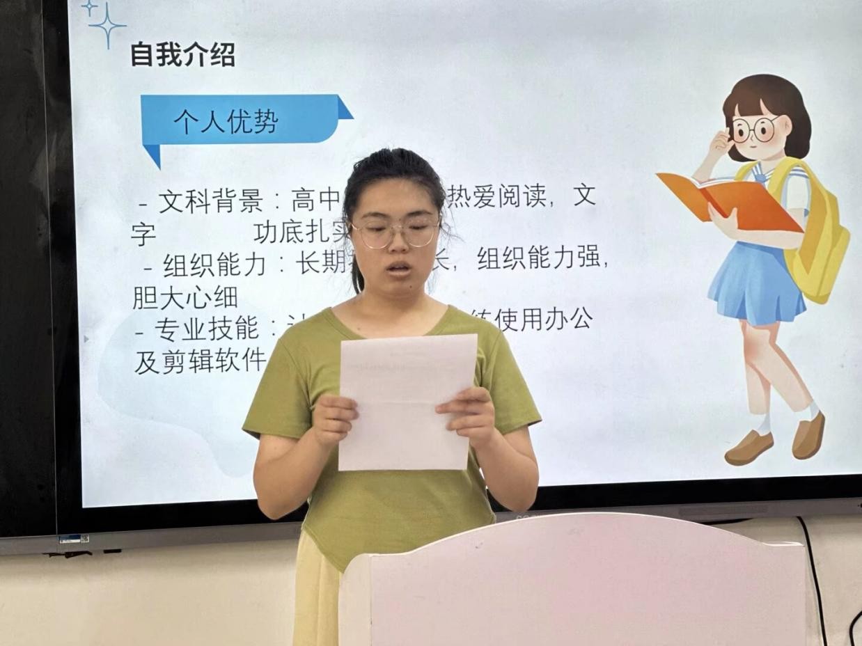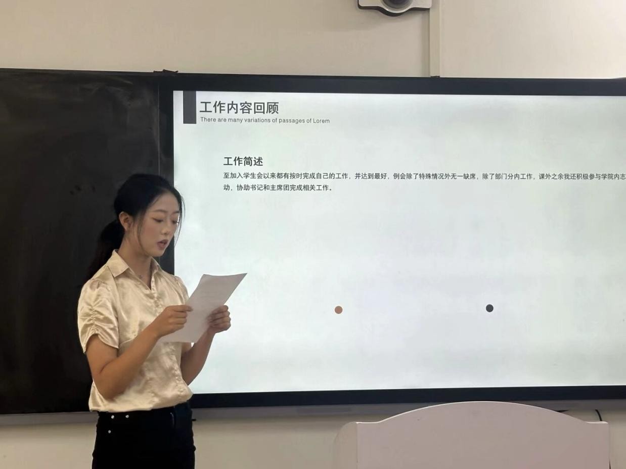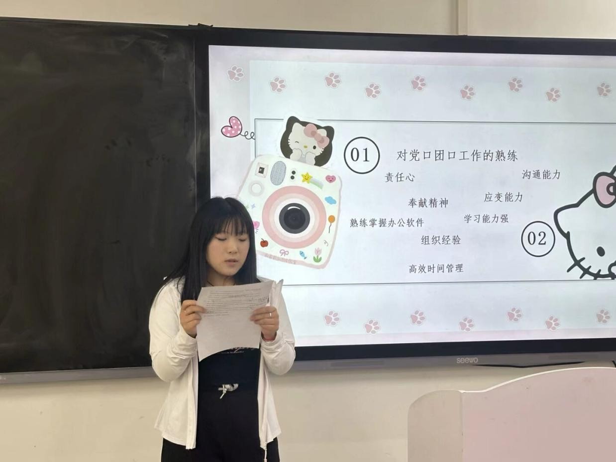 随后,参与竞选的同学们依次上台发表竞选演讲。她们自信满满,结合自身优势,阐述了对竞选岗位的理解和工作规划,表达了为学院和同学们服务的决心。