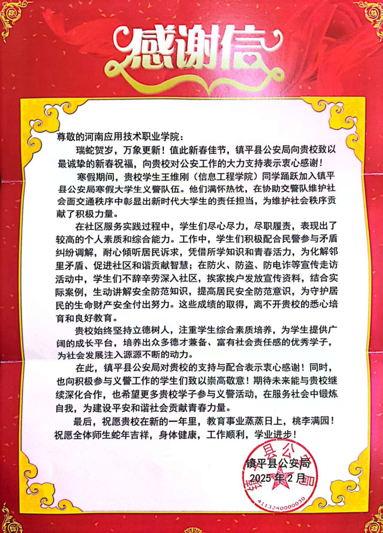2月21日,Beat365官方网站收到来自河南省南阳市镇平县公安局的感谢信,信中表达了对我院学生王维刚寒假期间加入镇平县公安局寒假大学生义务警队,协助指挥交通、维护交通秩序的赞扬,也对学校育人成果表示感谢。