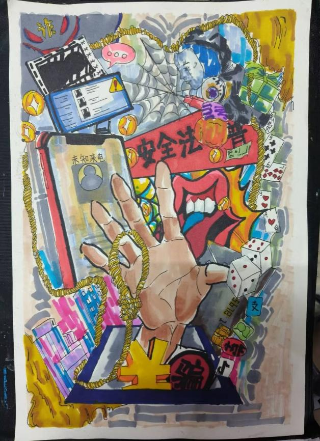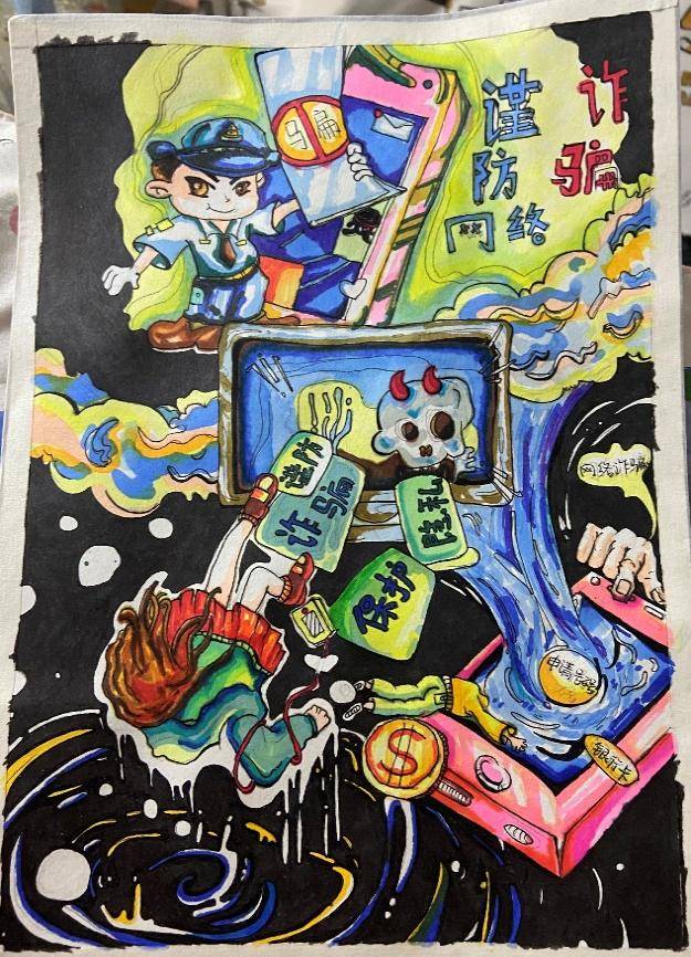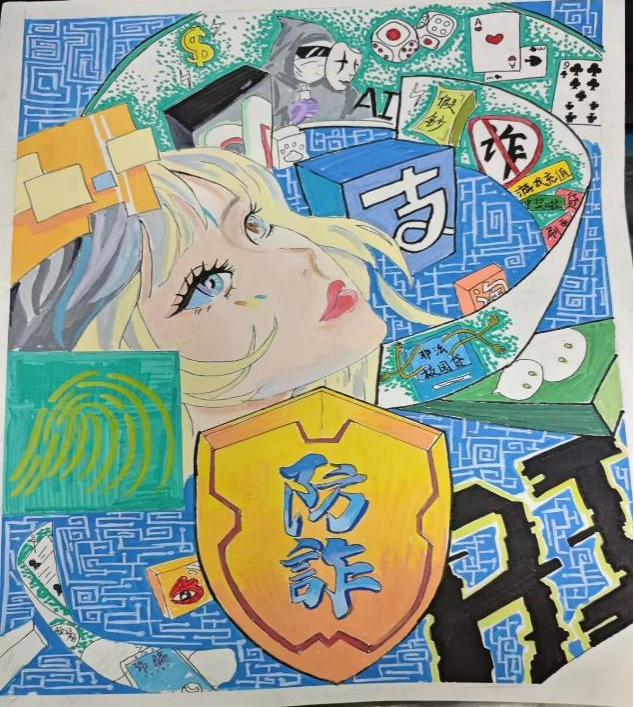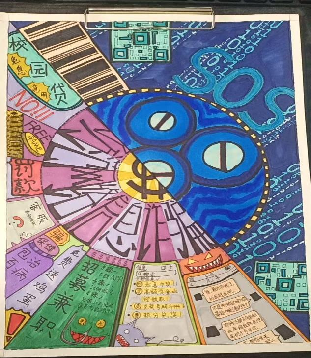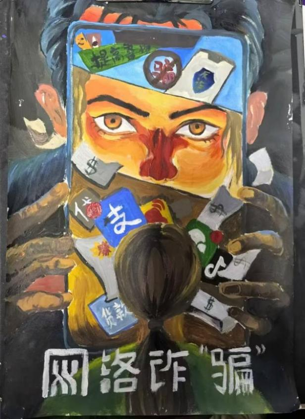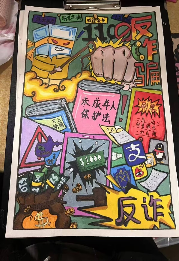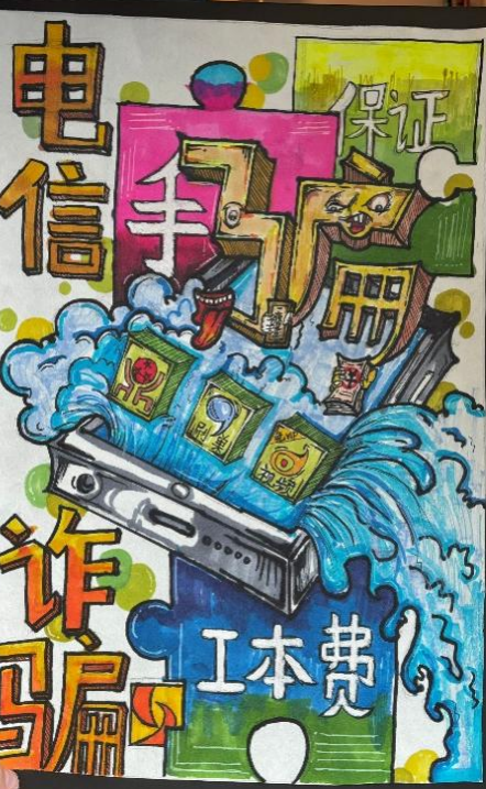 开展反诈创意作品征集活动,自开展以来,引起师生广泛关注、学生踊跃参与,共收到百余幅海报作品,同学们通过各种角度绘制反诈故事、普及防骗知识,其作品创意十足,兼具艺术感染力与教育警示意义,进一步加深了同学们对反诈防线的深刻理解。