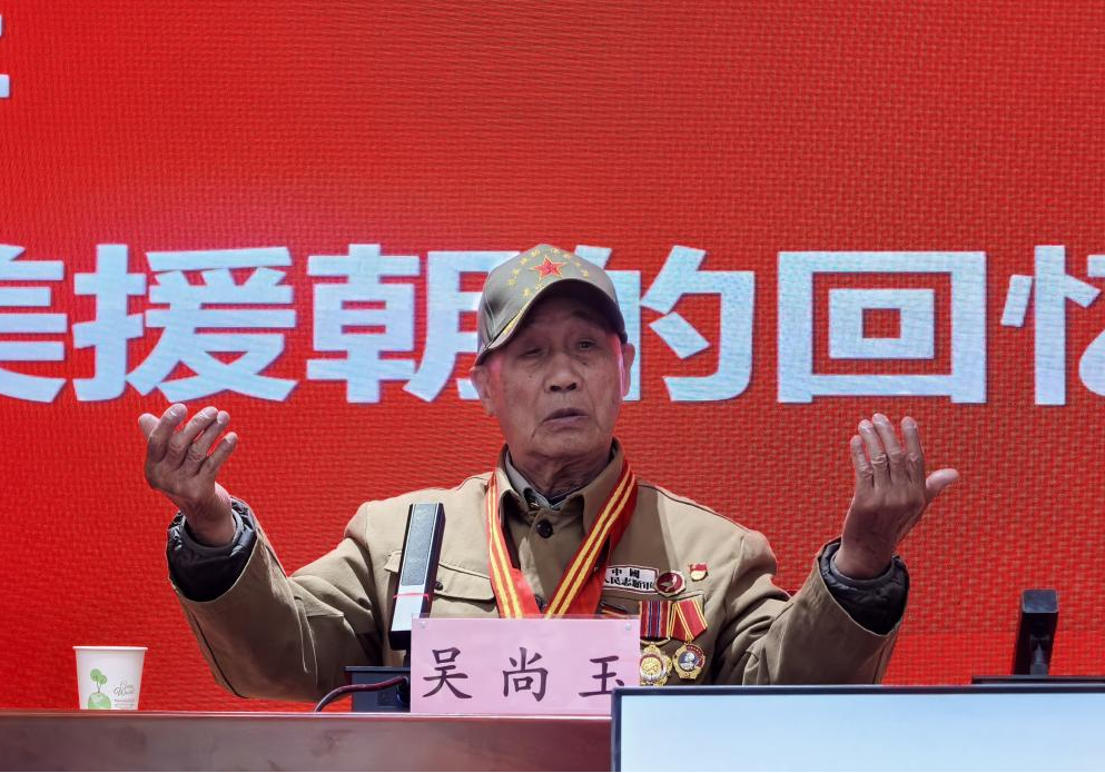 吴尚玉老先生,祖籍广西。1951年参加抗美援朝战争。他讲到,1952年美国军队用炮弹轰击我国军队时,炮弹从他的头顶擦过,鲜血顺着面颊直流,班长让他休息,他不顾伤势,仍然要求坚守战斗一线的感人故事。