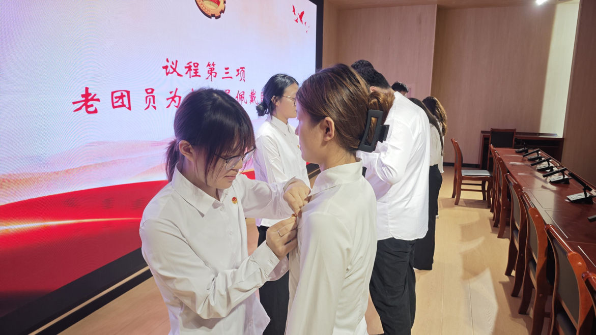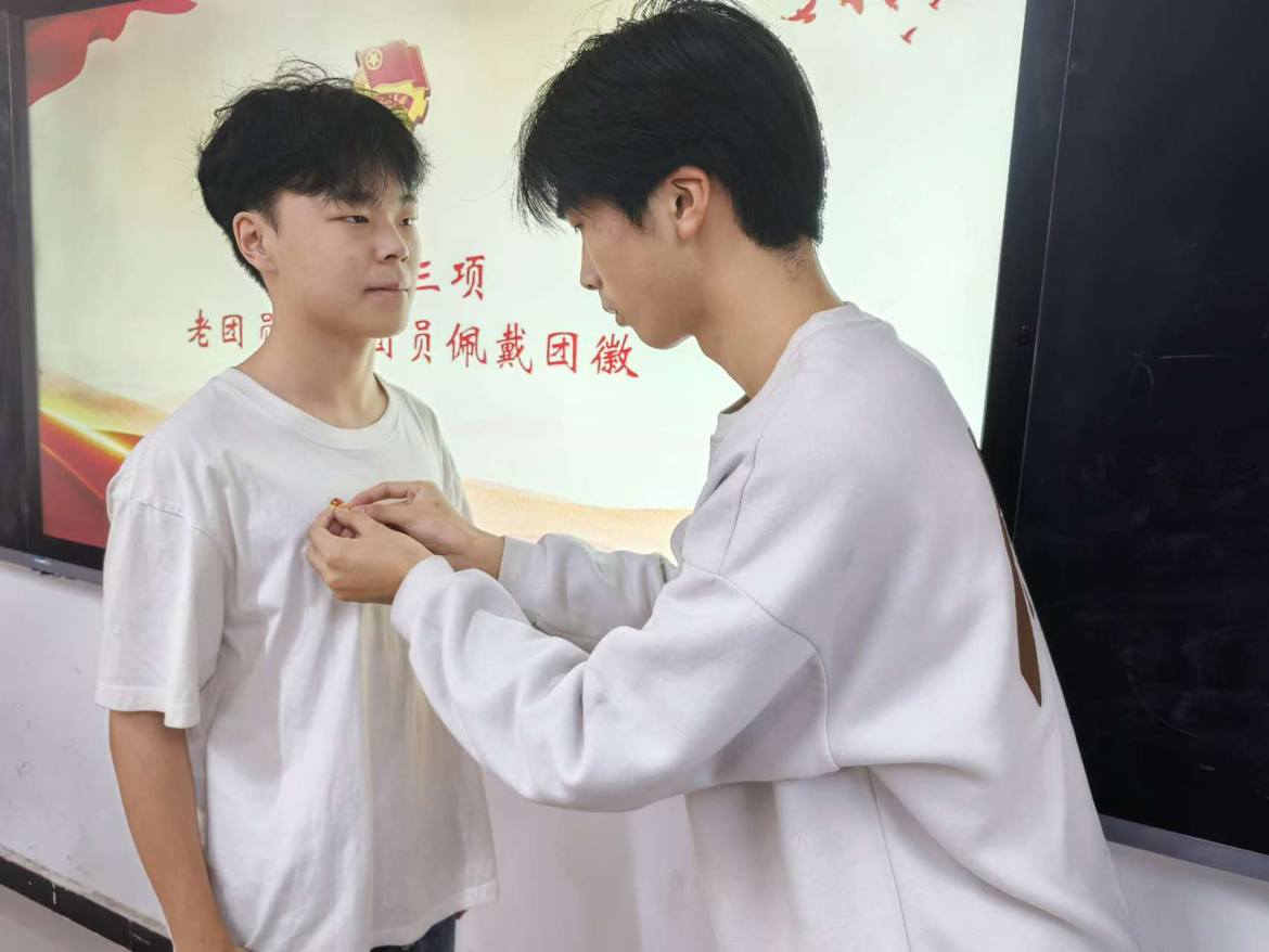 老团员代表手捧团徽,庄重地为新团员们佩戴在胸前。这一枚枚闪耀的团徽,不仅是荣誉的象征,更是一份沉甸甸的责任。