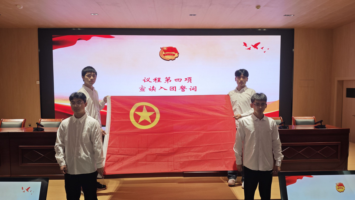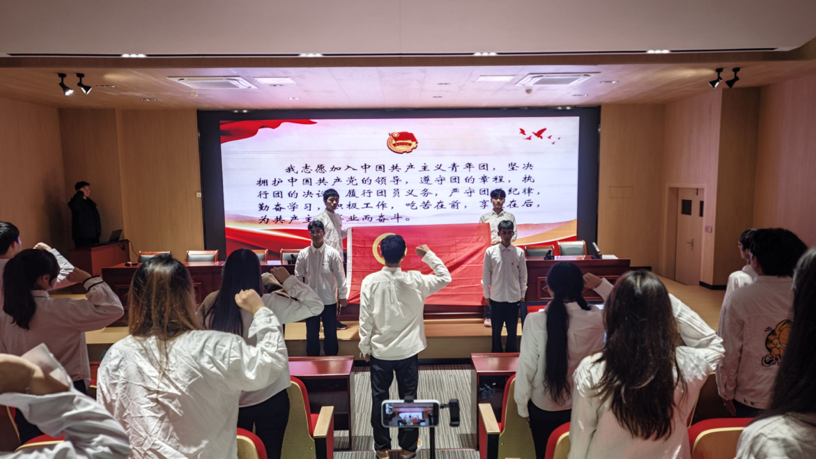 由老团员代表郭轩领誓,新团员跟誓,表达加入共青团的决心和承诺。