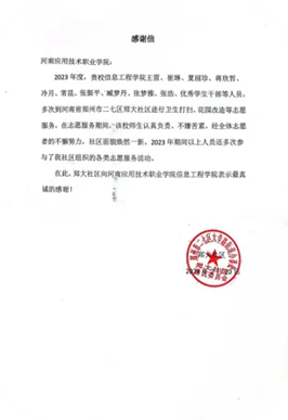各类特色志愿服务活动丰富多彩,“走访+帮扶”推进一对一服务,“破旧+树新”构建文明新风尚,连续三年大学生“返家乡”社会实践活动中我院学子多人获得先进个人、优秀志愿者称号,张振平教师被二七社区授予文明家庭、优秀志愿者,多名教师被社区致表扬信。