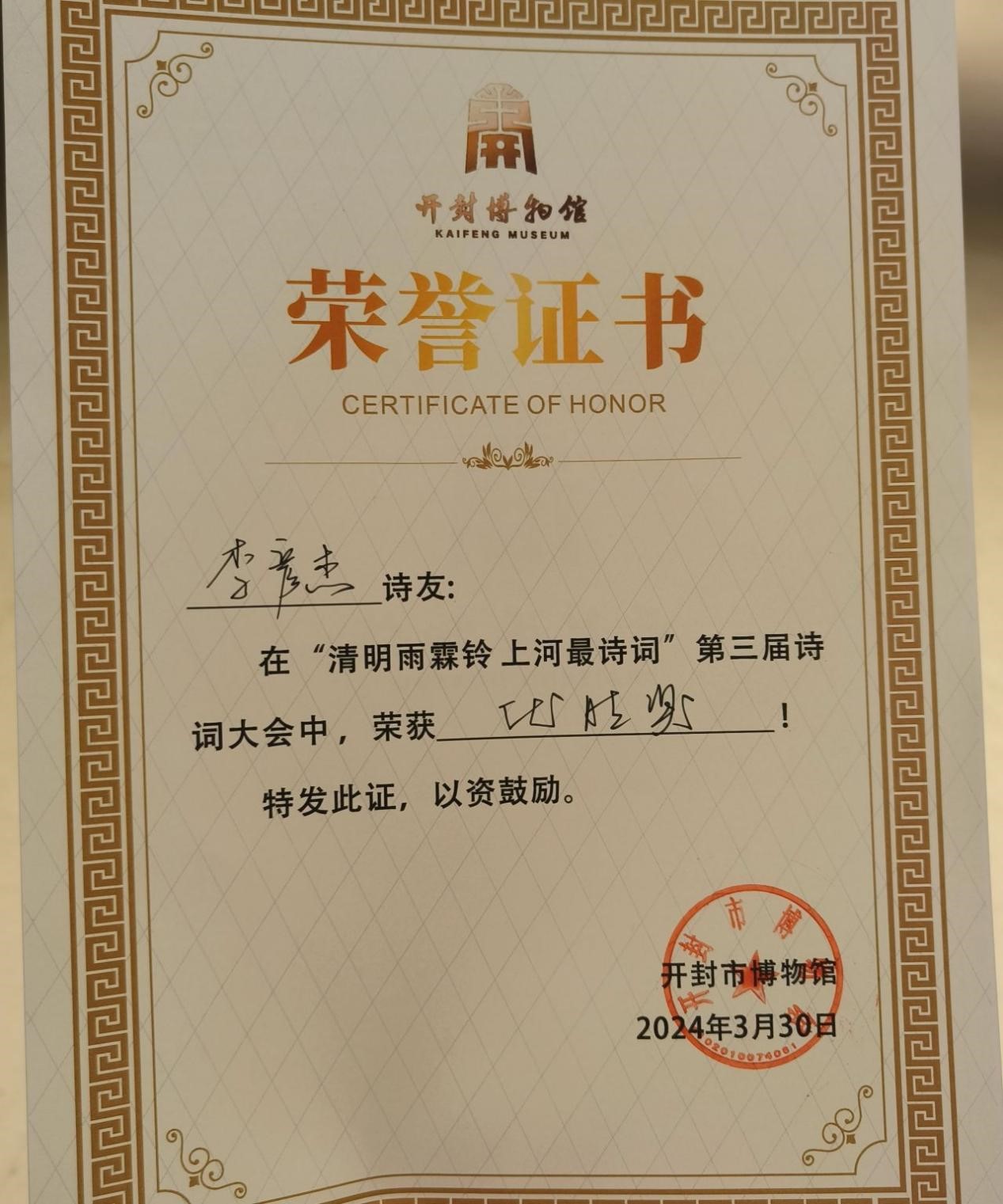 今天,我来到开封博物馆,内心充满了激动与喜悦。很荣幸能在开封博物馆举办的“第三届诗词大会”中获奖,这是我人生中一份特殊的、难忘的回忆。我们在比赛中互相学习、共同进步,这种氛围让我深受感动。在比赛中,我深入领略了诗词的韵味,感受到了中华文化的深厚底蕴。这次获奖是对我过去努力的肯定,也是对我未来学习的鞭策。我将珍惜这份荣誉,继续努力提升自己的诗词素养,为传承和弘扬中华文化贡献自己的力量。