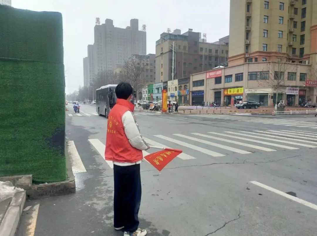 计算机2304班的陈鹤冉同学在荥阳市第六小学门口参与文明交通志愿公益活动,协助学生们上下学,确保学生能够安全地到达学校。用实际行动诠释“奉献、友爱、互助、进步”的志愿精神!
