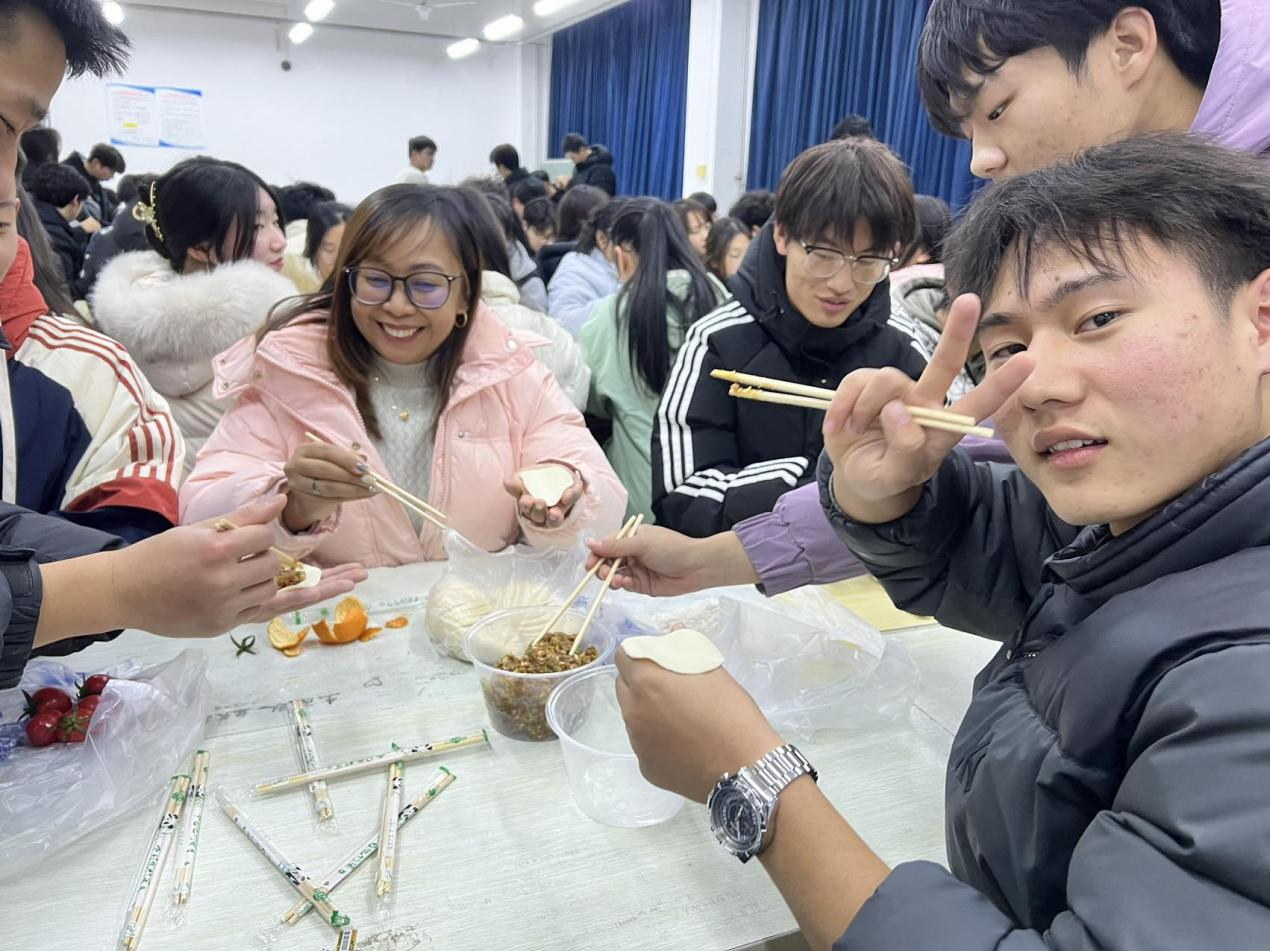 同学们相互展示着各自的包饺子技巧,捏出了各具特色的饺子形状,外教老师AIVEE热情的向同学们请教包饺子的秘诀:“左手托皮,右手放馅,馅放中间,皮边对折,然后再左手右手一个慢动作,两指用力一捏,一个可爱的饺子就诞生了。”经过几个小时的“大战”后,一碗碗热腾腾的饺子出锅了。