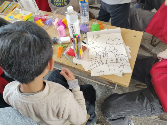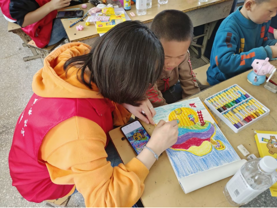 志愿者们到达黄岗小学后,分发材料,去到小朋友的班级里,带领小朋友们画画、做手工。志愿者们和小朋友共同创作,大胆挥洒手中的蜡笔,将脑海中的想象共同勾勒,颇具特色的萝卜屋、轮船、花朵、动画人物都成了小朋友们手中的主角,每个孩子都乐在其中,流连忘返。