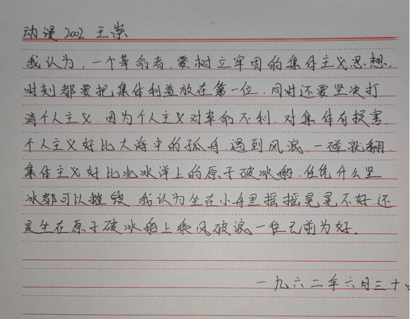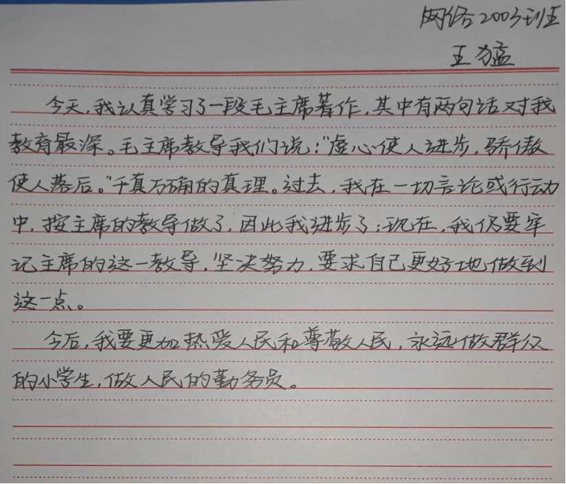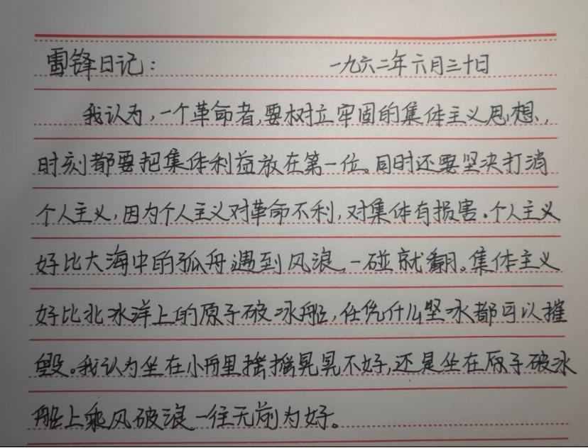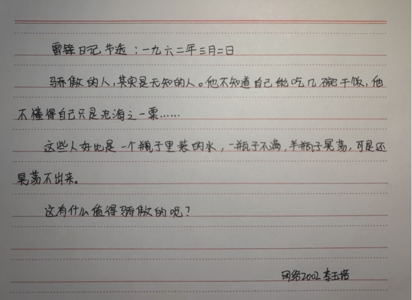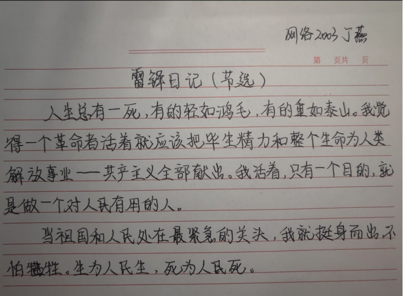随后,同学们拿起笔对雷锋日记的部分内容进行抄写。在抄写过程中同学们纷纷表示被雷锋朴实的文字所感动,并积极分享了自己的学习感悟,其中朱蒙恩同学引用雷锋同志的这样一句话“做群众的小孩子,做人民的勤务员。”他表示,作为一名青年团员,我们更应该大力弘扬雷锋精神,谨记并践行这句话,用雷锋精神激励自己,向雷锋同志学习。