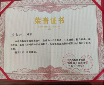 李佳坤,男,Beat365官方网站网络2101班。志愿服务内容:登记进入社区异地车辆,检查进出人员健康码、行程码,配合社区防疫工作。他说自己是一名大学生,应该为家乡抗疫奉献一份自己的力量,所以他积极参加社区防疫志愿活动。在此期间主要负责检查登记社区来往的车辆,协助工作人员进行防疫工作。他表示:在这次志愿活动中见识到了来自社会的巨大力量,坚信了我们必将战胜疫情的决心!